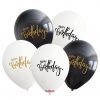 - Black and white themed Happy Birthday printed latex balloons are available in black and white colors with gold printing.